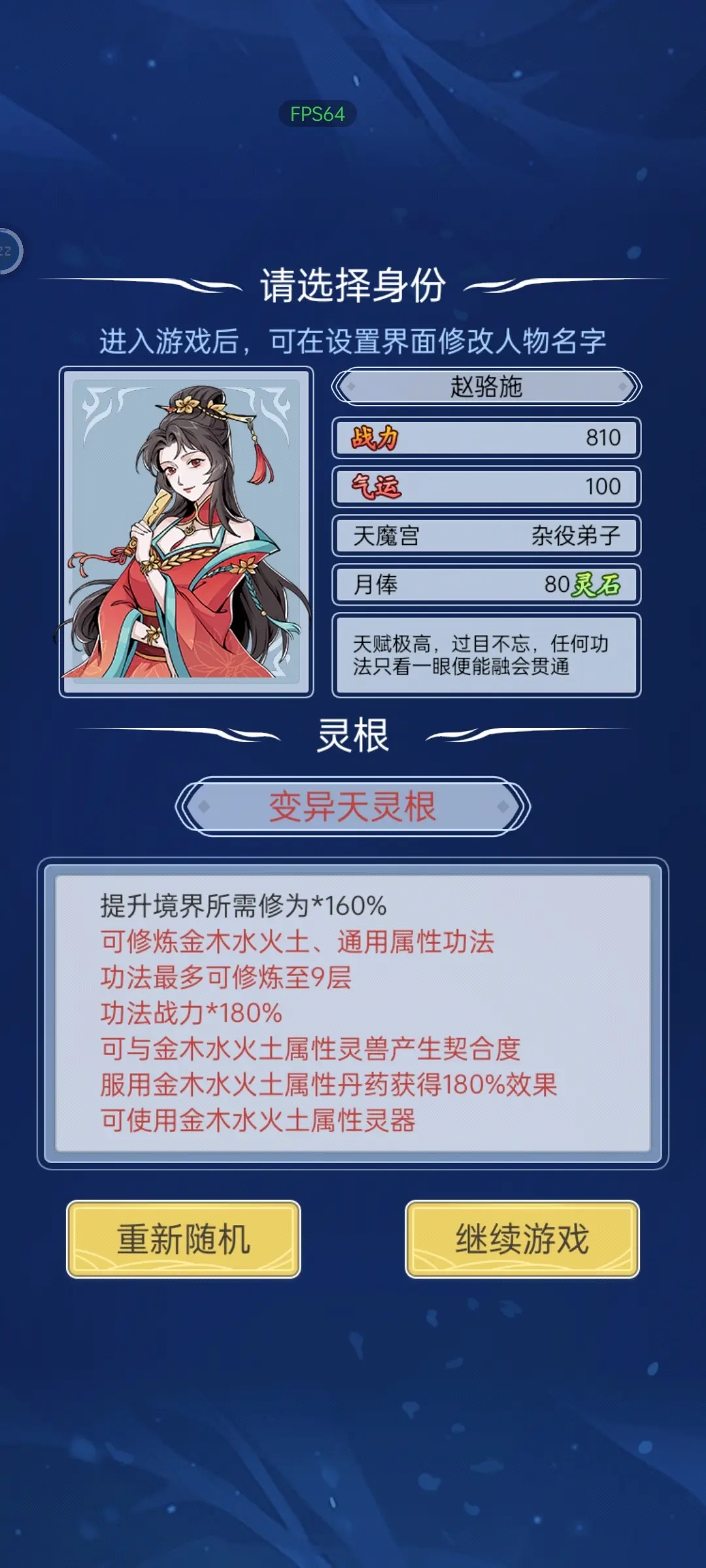 2、开局身份可自由选择,玩家能够通过重新随机的方式获取最优灵根。