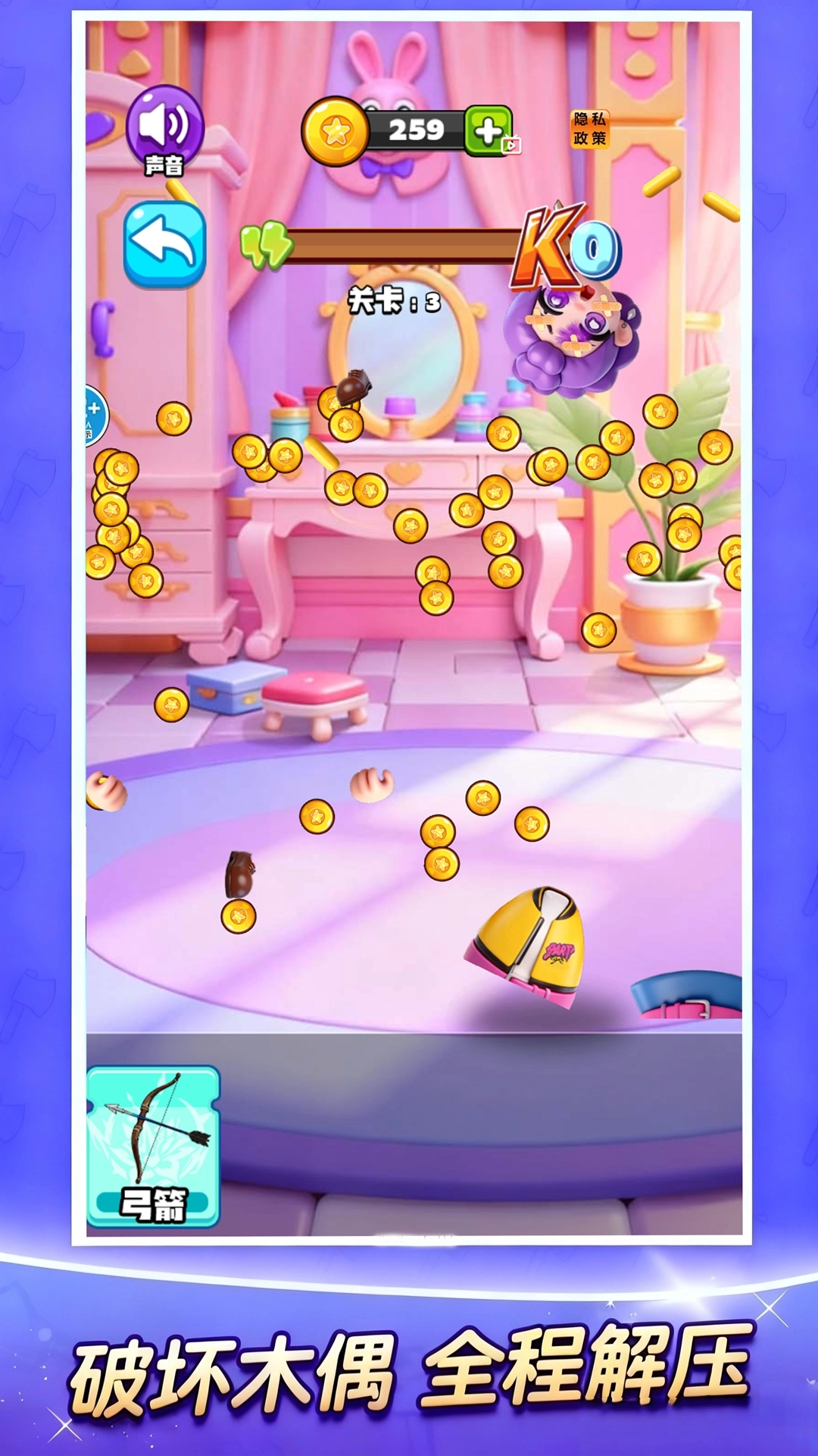 2、每次有效击中都会获得金币奖励,这些金币可用于在商店解锁铁锤、火焰喷射器、链锯等新武器。