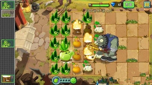 这个关卡的难点在于铜人会在10秒后复活,要是没能及时将其消灭,植物很容易被他踩死。开局时把白萝卜放在第五排附近,用来抵挡气功僵尸吸走植物,第四排可以放置火葫芦,等小僵尸靠近时,就能喷火把它们消灭掉。