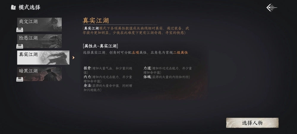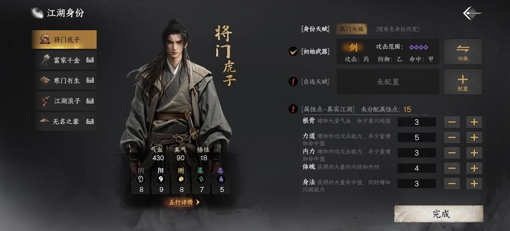 5、玩家能够挑选江湖身份,选定初始武器,还可以自主选择天赋,并对属性点进行分配;
