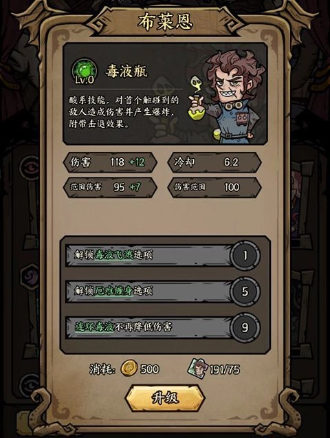 以毒液瓶作为武器,投掷出去后会发生爆炸并将敌人击退;当技能得到强化时,能够提升投掷的数量以及扩大影响范围。