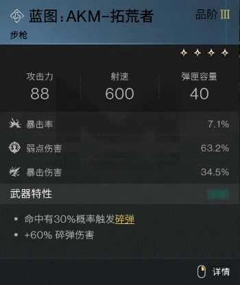 首先要提的是前期表现十分出色的AKM-拓荒者,尽管它只是蓝色品质,但“碎弹”以及“碎弹”增伤的特性相当实用,特别是在应对单体怪物时。最为关键的一点是,AKM的射速并不慢,并且自带40发容量的弹匣,无论是操作手感还是续航能力都让人感觉很舒适,新超越者们能够很快熟练使用它。