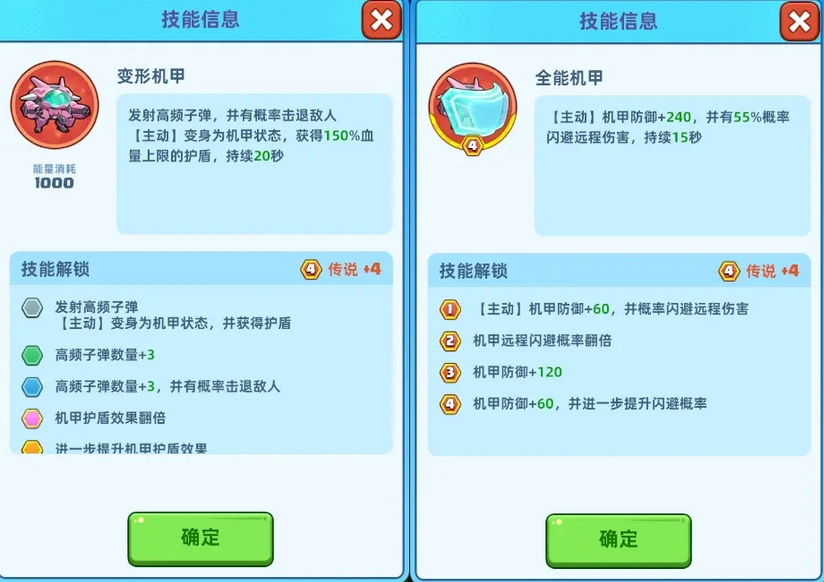 它的主动技能是变形机甲,释放大招后会召唤出强力机甲,不仅能提供高额护盾,射击时还有一定概率击退敌人,从而有效打乱敌方的推进节奏。