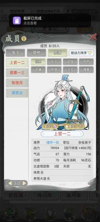 7、要记得每个月去与其他门派打好关系,当好感度和战力都达到要求后,就能将其收服,还能获得额外的灵石收益。