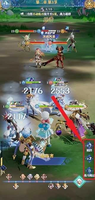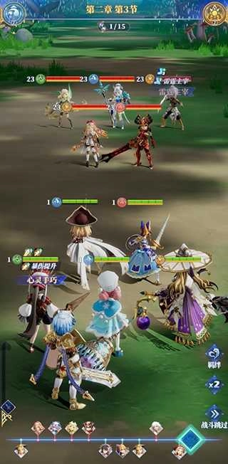 3、在战斗界面中,玩家可点击右侧的羁绊选项查看游戏角色的羁绊关系,也能通过点击下方的x2按钮来提升战斗节奏;若对战斗结果有十足把握,还可以直接点击下方的跳过按钮,一键快速结束当前战斗。