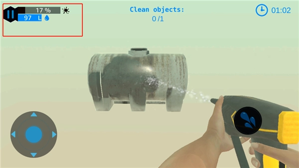 5、左上角设有进度条,其中黑色部分代表去污程度,当进度达到百分之百时,物体即可清理完成;水滴图标代表水量,若水量消耗至零,则通关失败。