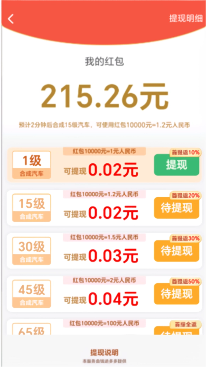 4、合成出的豪车等级越高,对应的红包奖励金额就越丰厚,等级和奖励金额呈正相关关系。