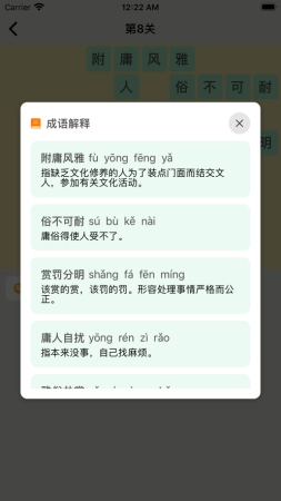 要是你对某个成语答不出来,失败之后系统还会展示这个成语的由来、含义和用法,这样你就能轻松理解它,并且熟练地运用它了。