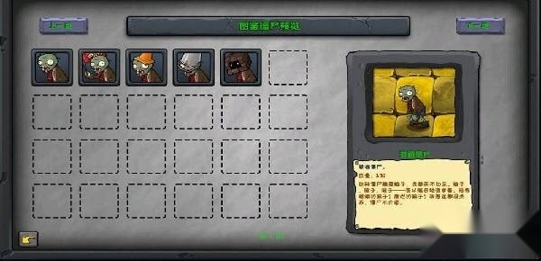 4、图鉴系统呈现各类僵尸的属性及背景故事,目前选中的是“路障僵尸”,右侧的文字说明介绍了它的防御机制,能帮助玩家制定相应的应对战术。