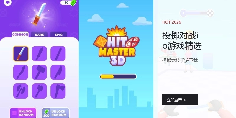 .io风格的多人在线竞技游戏,核心玩法是投掷武器(如斧头、飞刀、手里剑)攻击对手,将其击出战场。玩家需要预判走位,计算抛物线,在移动中精准投掷。地图中可能有道具和障碍,规则简单,对抗激烈,适合快速开局享受乱斗乐趣。欢迎下载体验。