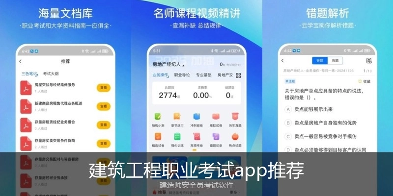 服务于建筑、工程、安全等领域从业者的职业资格考试备考工具。收录建造师、安全员、消防工程师、房地产经纪人等考试的海量真题、考点解析、模拟试卷和视频课程。支持智能刷题、错题巩固、离线学习,帮助考生高效利用碎片时间,精准把握考试重点,顺利通过认证。